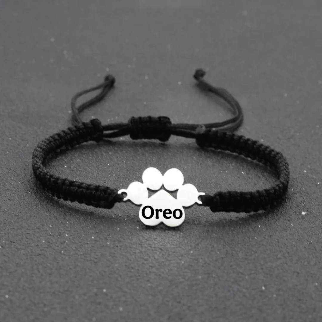 Crafted with a durable braided cord and a premium stainless steel paw charm, this bracelet proudly carries your pet’s name — so they’re always with you, no matter where life takes you.